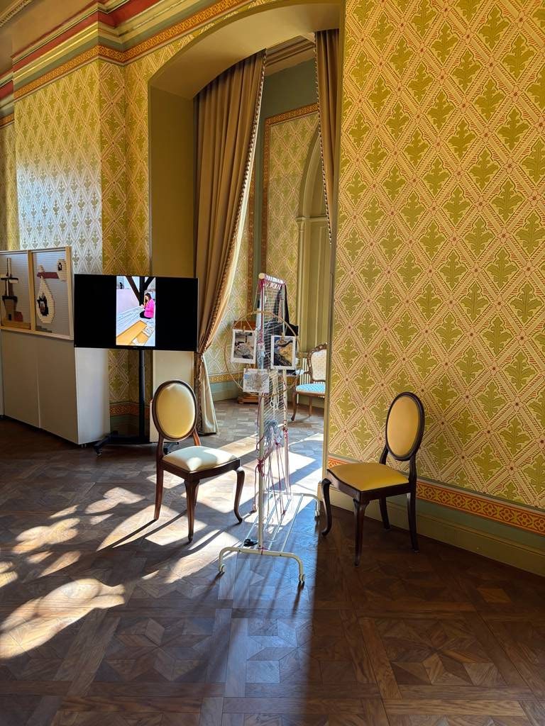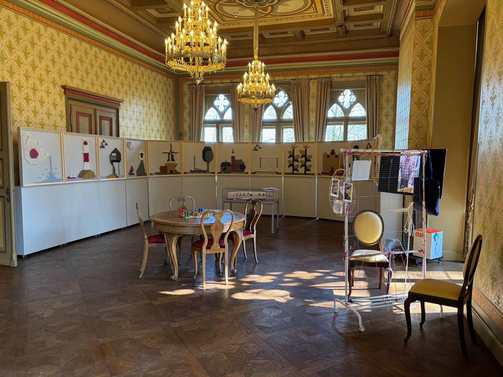 An einer Station im Festsaal können Besucherinnen und Besucher selbst versuchen, den sog. Kreuzstich auszuprobieren. Hier sind nun die Polsterstühle im Einsatz!
